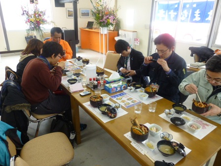 震災後に復活した食堂の新メニュー開発に携わる貫牛さん。(オレンジ色のジャンパーの方です)この日は試食会で私たちも参加させて頂きました。)