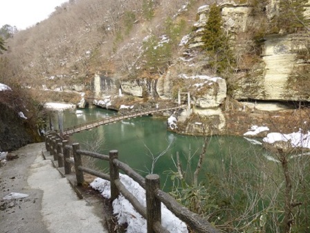 研修の後、南会津郡下郷町にある塔のへつりに連れていっていただきました。福島県では有名の観光所の一つで国の天然記念物にも指定されている景勝地です。「へつり」とは会津方言で、川に迫った険しい断崖のことを言うそうです。今回の震災で直接的被害は免れたようですが、先日の記事と同様に観光地の利用者数は激減しているようです。実際に私たちが塔のへつりにいるときも観光に来ている方はほとんどいませんでした。福島第一原子力発電所から離れたこの町でもそのような事態であることを知り、風評被害の及ぼす大きさに衝撃を感じました。