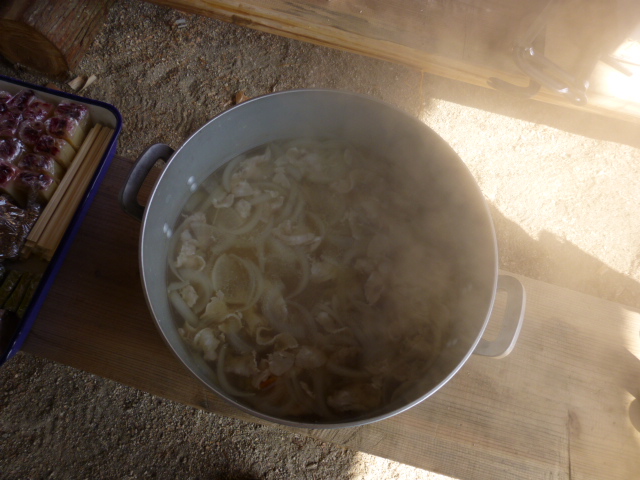 お昼の休憩時間。現地のおかあさん方が作ってくれた豚汁をいただきました。