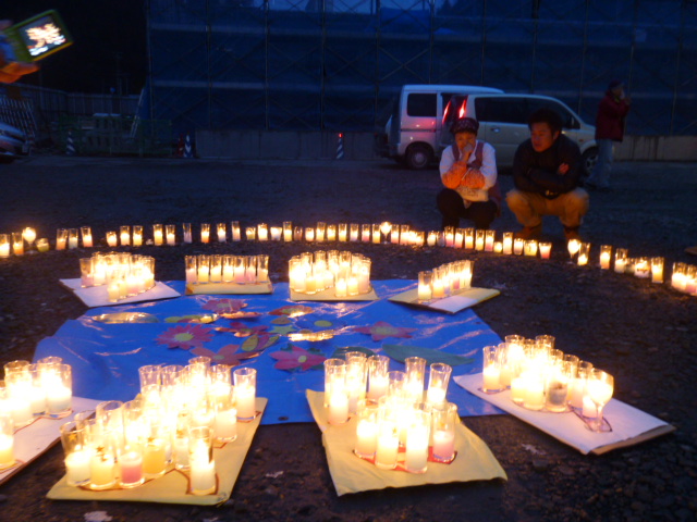 そんなこんなで、ビラ配りを終えた昨日。頼もしいことに今日は都留文科大学災害ボランティアチームの大学生さんの応援もあって、キャンドルを並べる台紙もあっという間に完成。都留文のみんな、ありがとう!