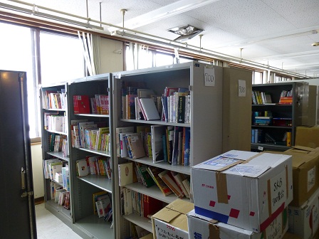 ここは実際その仕分けられた本が保管されている倉庫です。送られてきた本の数は現在までに約25万冊です。送られてくる本の中でもっとも多いのが詩など文芸書に分類されるジャンルの本です。また作品別に見て最も多く送られてきた作品は『星の王子様』の100冊で、次いで『五体不満足』だそうです。寄付される本の傾向としては少し前に流行した本が多いそうです。逆に日曜大工やレシピ本など実用書は不足していて足りないそうです。また倉庫で使っている本棚の数にも限りがあり、現在は東日本大震災の時に倒壊の認定をされ、取り壊しになった遠野市役所の建物で使われていたロッカーなどが本棚の代わりとして使われています。下の写真は現在、本棚として使われている職員のロッカーです。